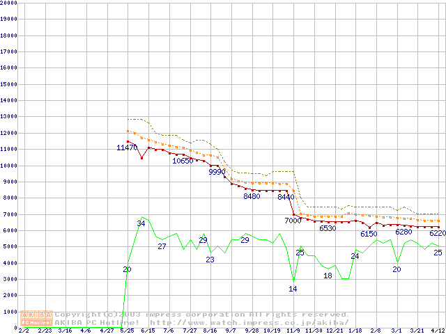 Socket 370 (FC-PGA2,FSB 100MHz,L2 256KB,Tualatin)の最安値推移