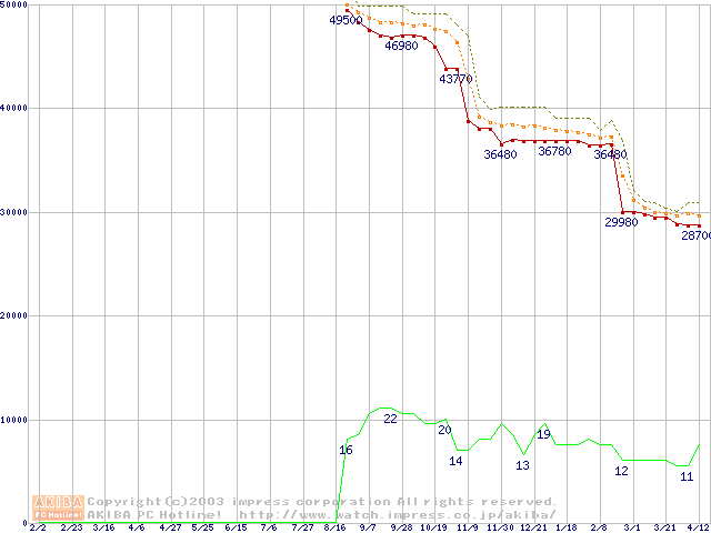 Socket 478 (micro-PGA,FSB 400MHz,L2 512KB,Northwood)の最安値推移
