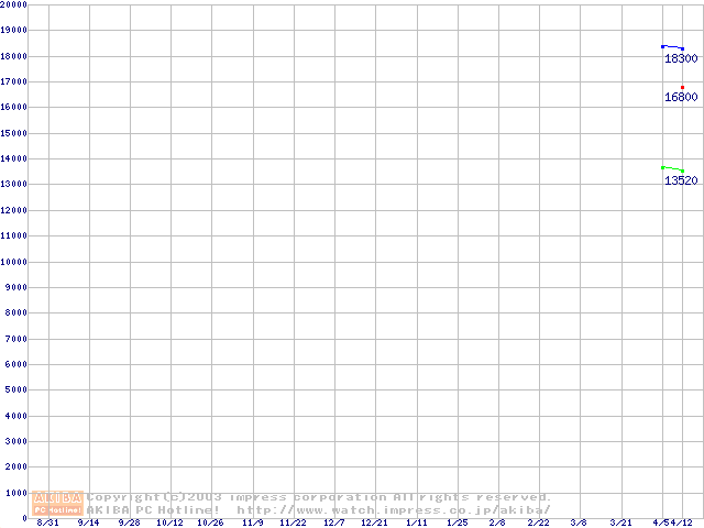 | [↑前グラフ]: | Travelstar 80GN (8.5mm,4200rpm,UltraATA/100,8MB,FDB,40GB/Platter)の最安値推移 |