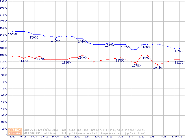| [↑前グラフ]: | MKシリーズ (9.5mm,4200rpm,2MB,FDB,20GB/Platter)の最安値推移 |
