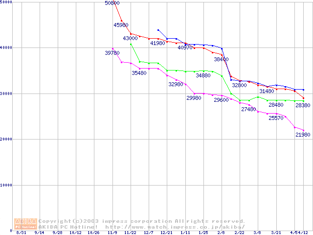 | [↓次グラフ]: | Socket A (OPGA,FSB 266MHz,L2 256KB,Thoroughbred)の最安値推移 |