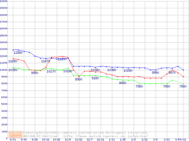 | [↓次グラフ]: | Socket A (OPGA,FSB 266MHz,L2 256KB,Thoroughbred)の最安値推移 |