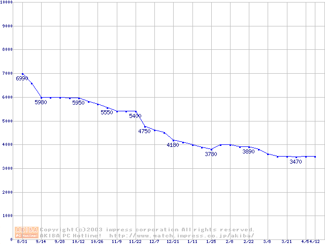 | Socket A (PGA,FSB 200MHz,L2 256KB,Thunderbird)の最安値推移 |