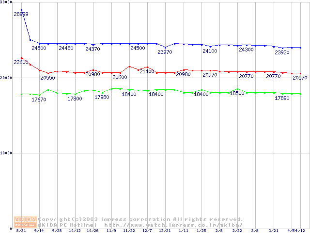 | [↑前グラフ]: | Socket 478 (micro-PGA,FSB 400MHz,L2 128KB,Willamette)の最安値推移 |