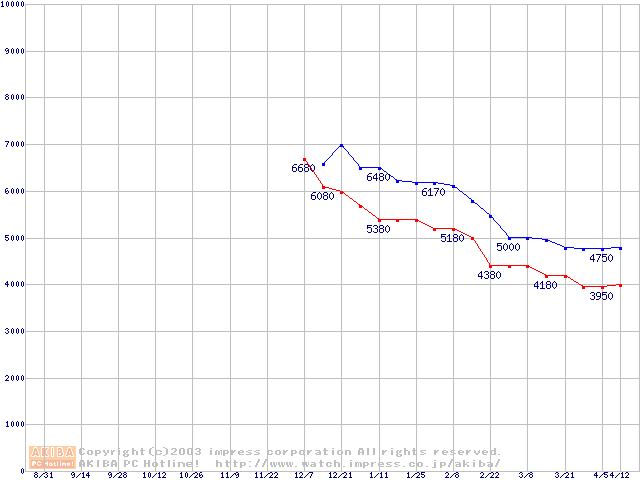 | [↑前グラフ]: | Socket 370 (PGA,FSB 133MHz,L2 64KB,Nehemiah)の最安値推移 |