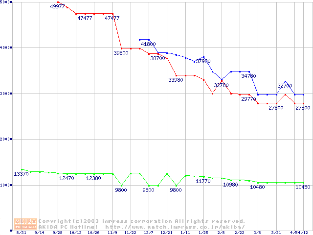 | [↓次グラフ]: | Socket 478 (micro-PGA,FSB 533MHz,L2 512KB,Hyper-Threading,Northwood)の最安値推移 |