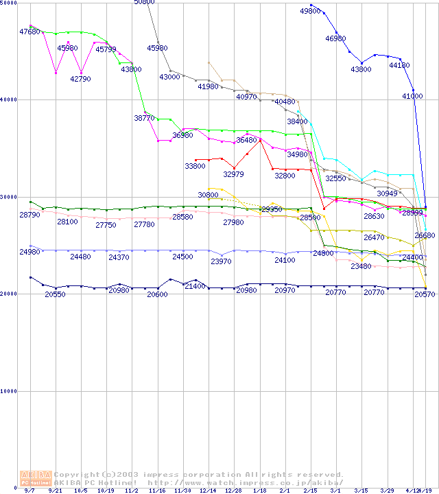 CPU主要製品(最安値2万円~3万円未満)の最安値推移