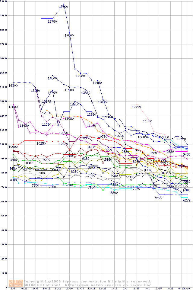 HDD主要製品(最安値1万円~1万5千円未満)の最安値推移