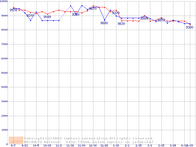 | [↓次グラフ]: | HDD 80GB~100GB未満(5400rpmクラス)の最安値推移 |