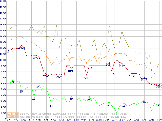 PC2100(DDR266) DDR SDRAM DIMM ECC対応 Registeredタイプの最安値推移