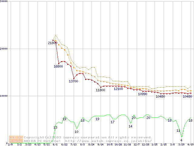 Travelstar 40GNX (9.5mm,5400rpm,UltraATA/100,8MB,FDB,20GB/Platter)の最安値推移