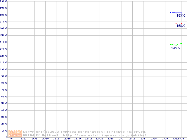 | [↑前グラフ]: | Travelstar 80GN (8.5mm,4200rpm,UltraATA/100,8MB,FDB,40GB/Platter)の最安値推移 |