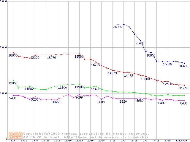 | [↑前グラフ]: | DiamondMax 16 (5400rpm,UltraATA/133,2MB,80GB/Platter,BB)の最安値推移 |