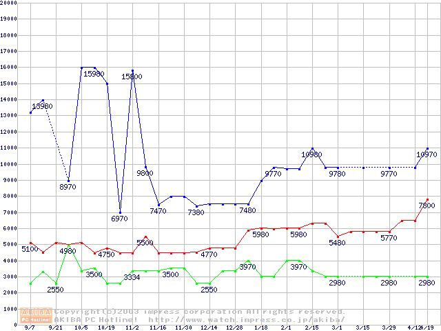 | [↑前グラフ]: | PC133 SDRAM DIMM CasLatency=2の最安値推移 |