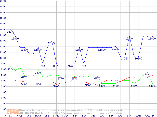 | [↓次グラフ]: | PC100 SDRAM DIMM CasLatency=2の最安値推移 |