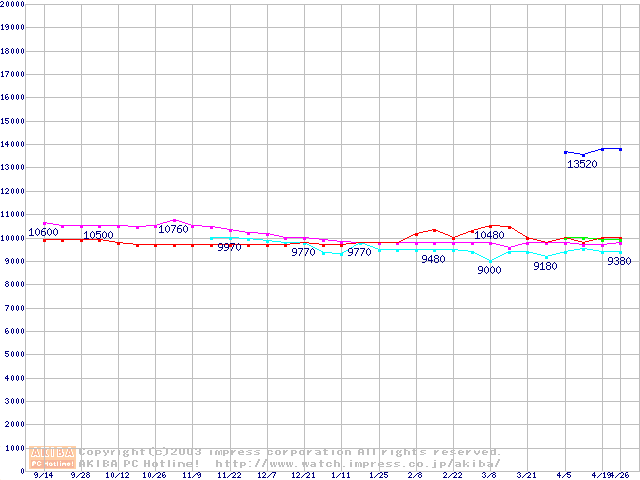 | [↓次グラフ]: | 2.5インチHDD 30GB~40GB未満(9.5mm厚)の最安値推移 |