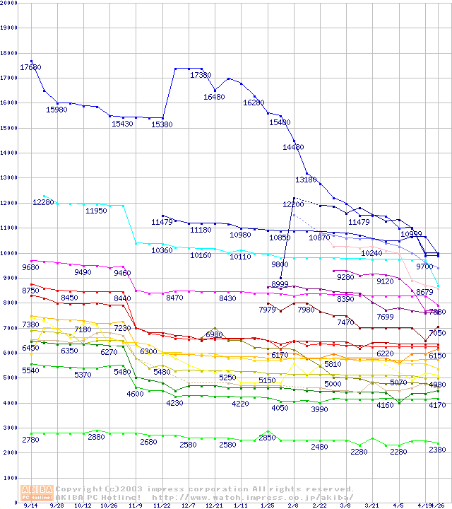 CPU主要製品(最安値1万円~2万円未満)の最安値推移