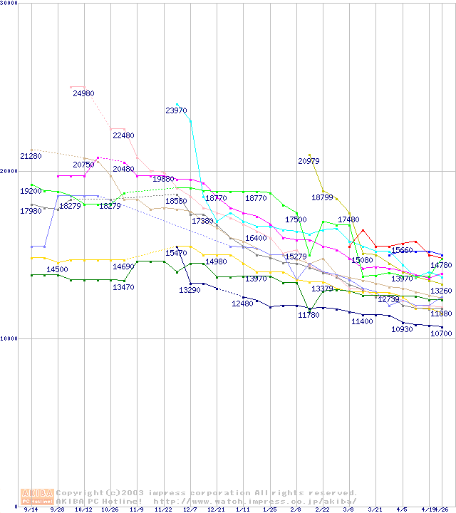 HDD主要製品(最安値1万円~1万5千円未満)の最安値推移