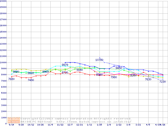 | [↓次グラフ]: | HDD 60GB~80GB未満(7200rpmクラス)の最安値推移 |