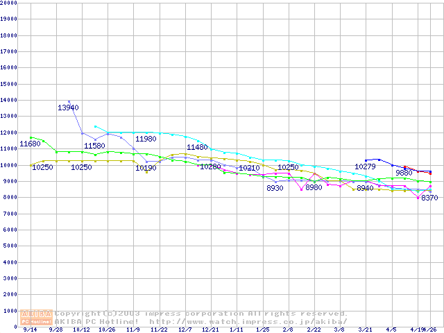 | [↓次グラフ]: | HDD 80GB~100GB未満(7200rpmクラス)の最安値推移 |