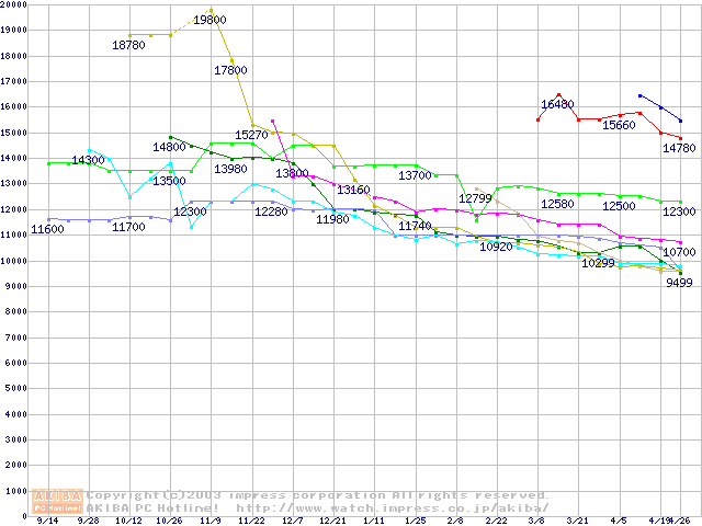 | [↓次グラフ]: | HDD 100~160GB未満(7200rpmクラス)の最安値推移 |