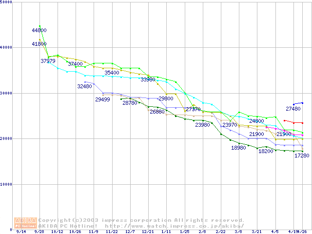 HDD 100~160GB未満(7200rpmクラス)の最安値推移