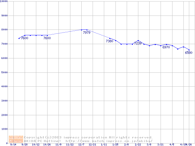 | [↑前グラフ]: | HDD 20GB~30GB未満(5400rpmクラス)の最安値推移 |