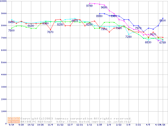 | [↓次グラフ]: | HDD 60GB~80GB未満(5400rpmクラス)の最安値推移 |