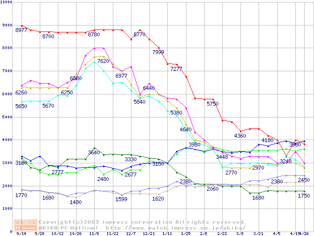 メモリ主要製品(最安値5千円未満)の最安値推移