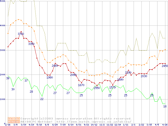 PC100 SDRAM DIMM CasLatency=2の最安値推移