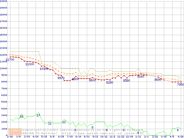 WD Caviar (7200rpm,UltraATA/100,20GB/Platter)の最安値推移