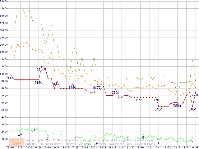 PC133 SDRAM DIMM CasLatency=3 ECC対応 Registeredタイプの最安値推移