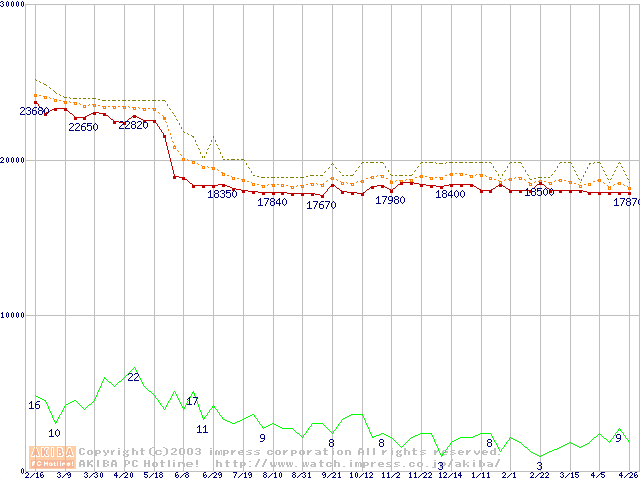 Socket 370 (FC-PGA2,FSB 133MHz,L2 512KB,Tualatin)の最安値推移