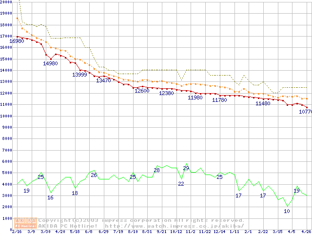 Travelstar 40GN (9.5mm,4200rpm,UltraATA/100,2MB,FDB,20GB/Platter)の最安値推移