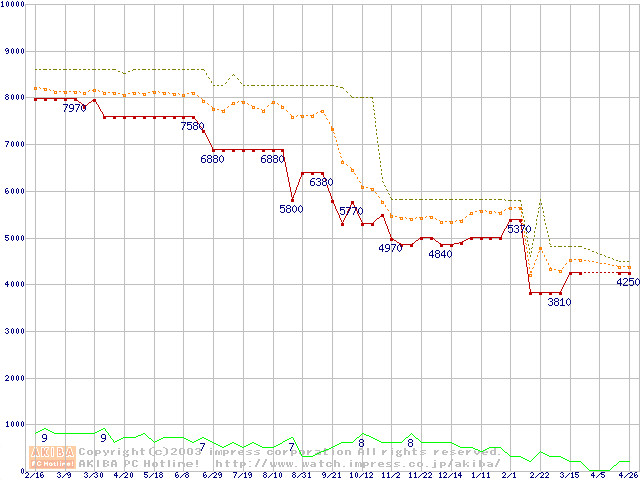 Socket 370 (PGA,FSB 100MHz,L2 64KB,Ezra)の最安値推移