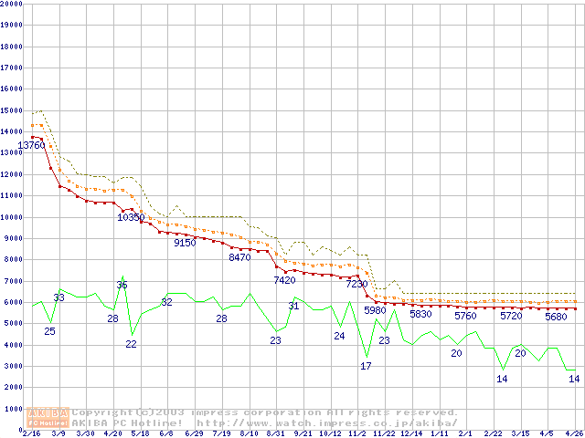 Socket 370 (FC-PGA2,FSB 100MHz,L2 256KB,Tualatin)の最安値推移