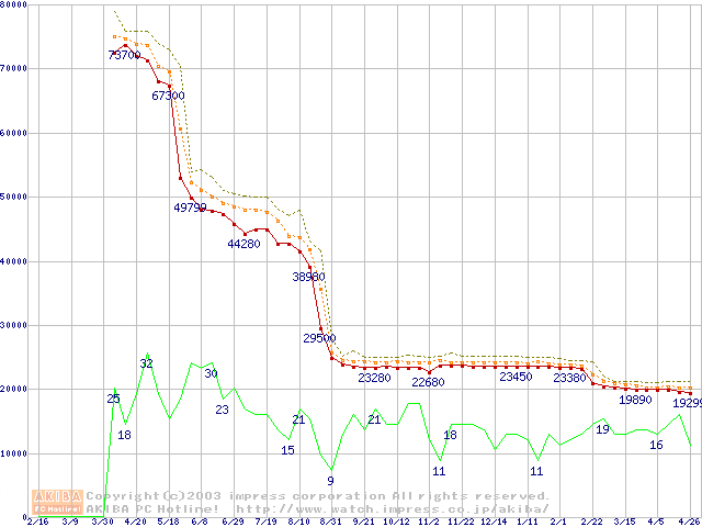 Socket 478 (micro-PGA,FSB 400MHz,L2 512KB,Northwood)の最安値推移