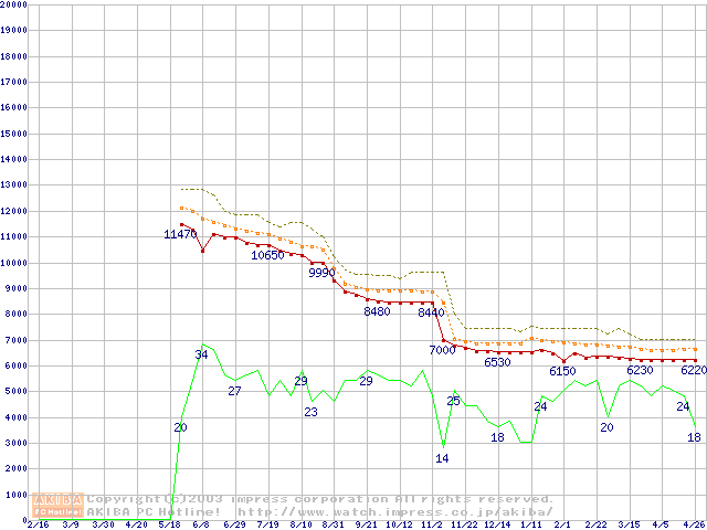 Socket 370 (FC-PGA2,FSB 100MHz,L2 256KB,Tualatin)の最安値推移