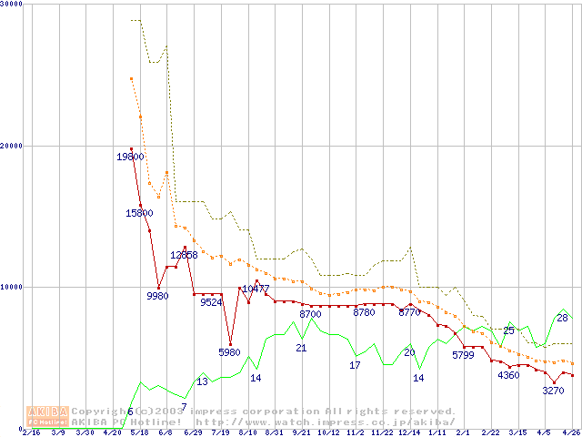 PC3200(DDR400) DDR SDRAM DIMMの最安値推移