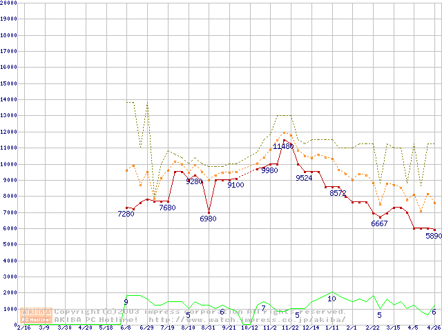 PC2100(DDR266) DDR SDRAM DIMM(CL 2.0) ECC対応 Registeredタイプの最安値推移