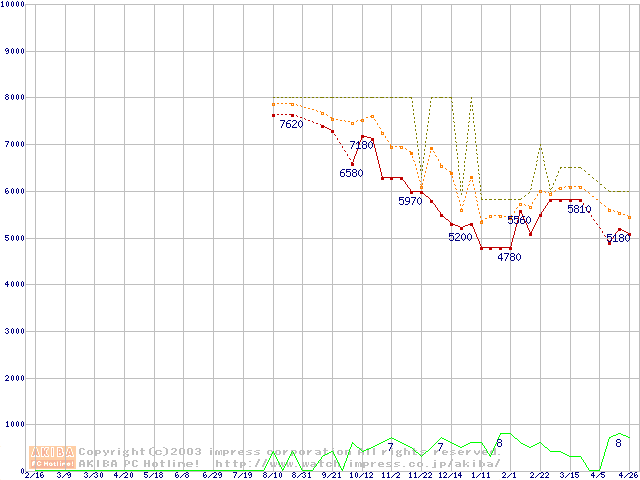 Socket 370 (FC-PGA,FSB 100MHz,L2 128KB,Coppermine)の最安値推移