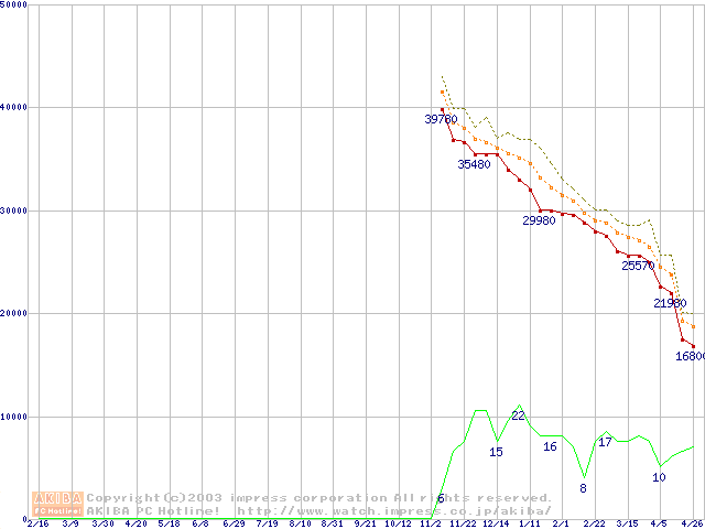 Socket A (OPGA,FSB 333MHz,L2 256KB,Thoroughbred)の最安値推移
