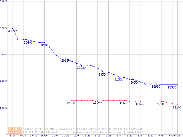 | [↑前グラフ]: | MKシリーズ (9.5mm,5400rpm,16MB,FDB,20GB/Platter)の最安値推移 |