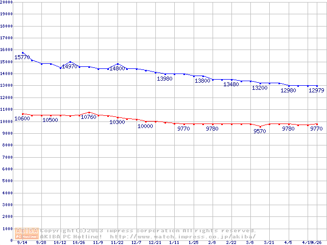 | [↑前グラフ]: | MKシリーズ (9.5mm,4200rpm,2MB,FDB,30GB/Platter)の最安値推移 |