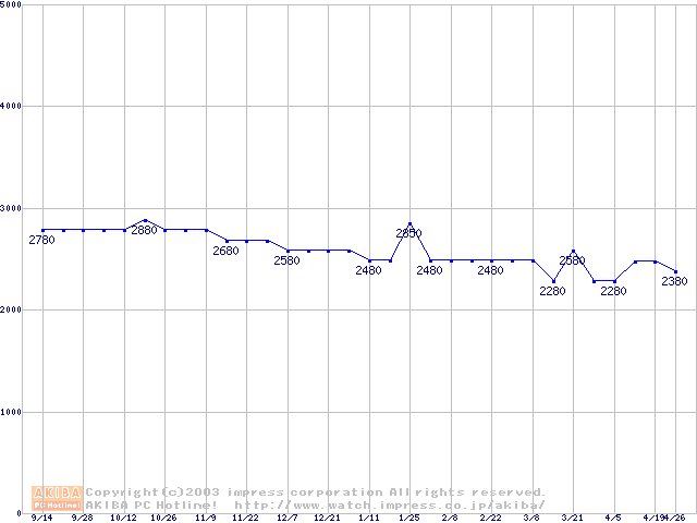 | [↑前グラフ]: | Socket A (PGA,FSB 200MHz,L2 64KB,Morgan)の最安値推移 |