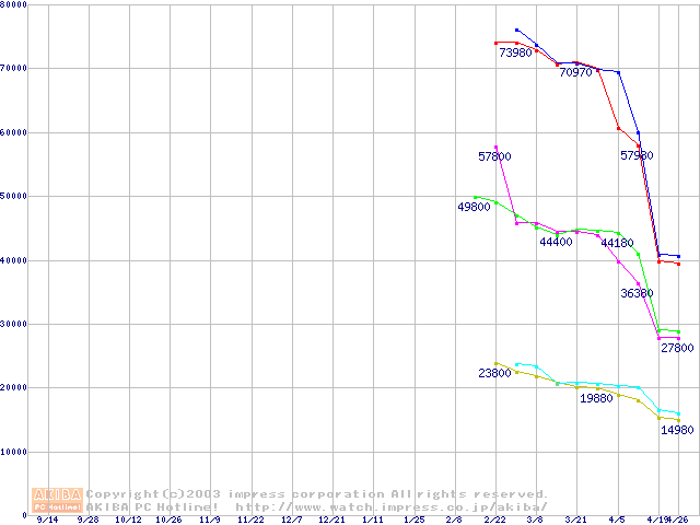 | [↓次グラフ]: | Socket A (OPGA,FSB 333MHz,L2 256KB,Thoroughbred)の最安値推移 |