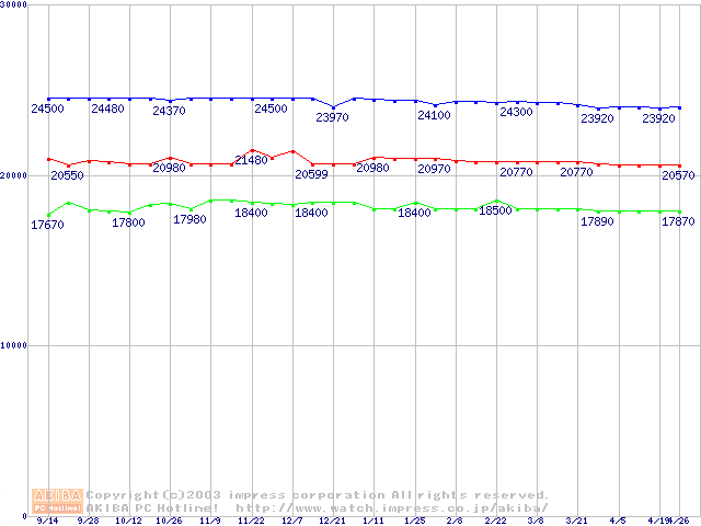 | [↑前グラフ]: | Socket 478 (micro-PGA,FSB 400MHz,L2 128KB,Willamette)の最安値推移 |