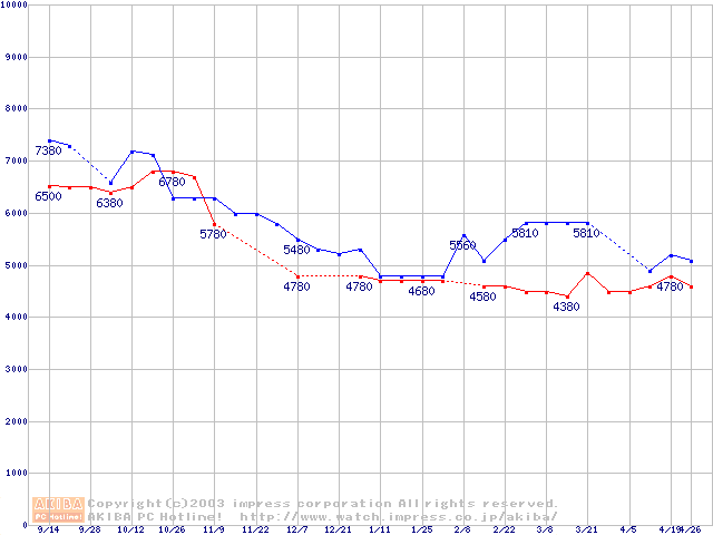 | [↑前グラフ]: | Socket 370 (FC-PGA2,FSB 100MHz,L2 256KB,Tualatin)の最安値推移 |