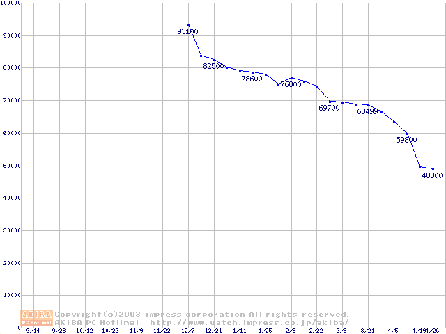 | [↑前グラフ]: | Socket 478 (micro-PGA,FSB 800MHz,L2 512KB,Hyper-Threading,Northwood)の最安値推移 |