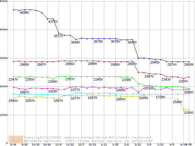 | [↑前グラフ]: | Socket 478 (micro-PGA,FSB 533MHz,L2 512KB,Northwood)の最安値推移 |